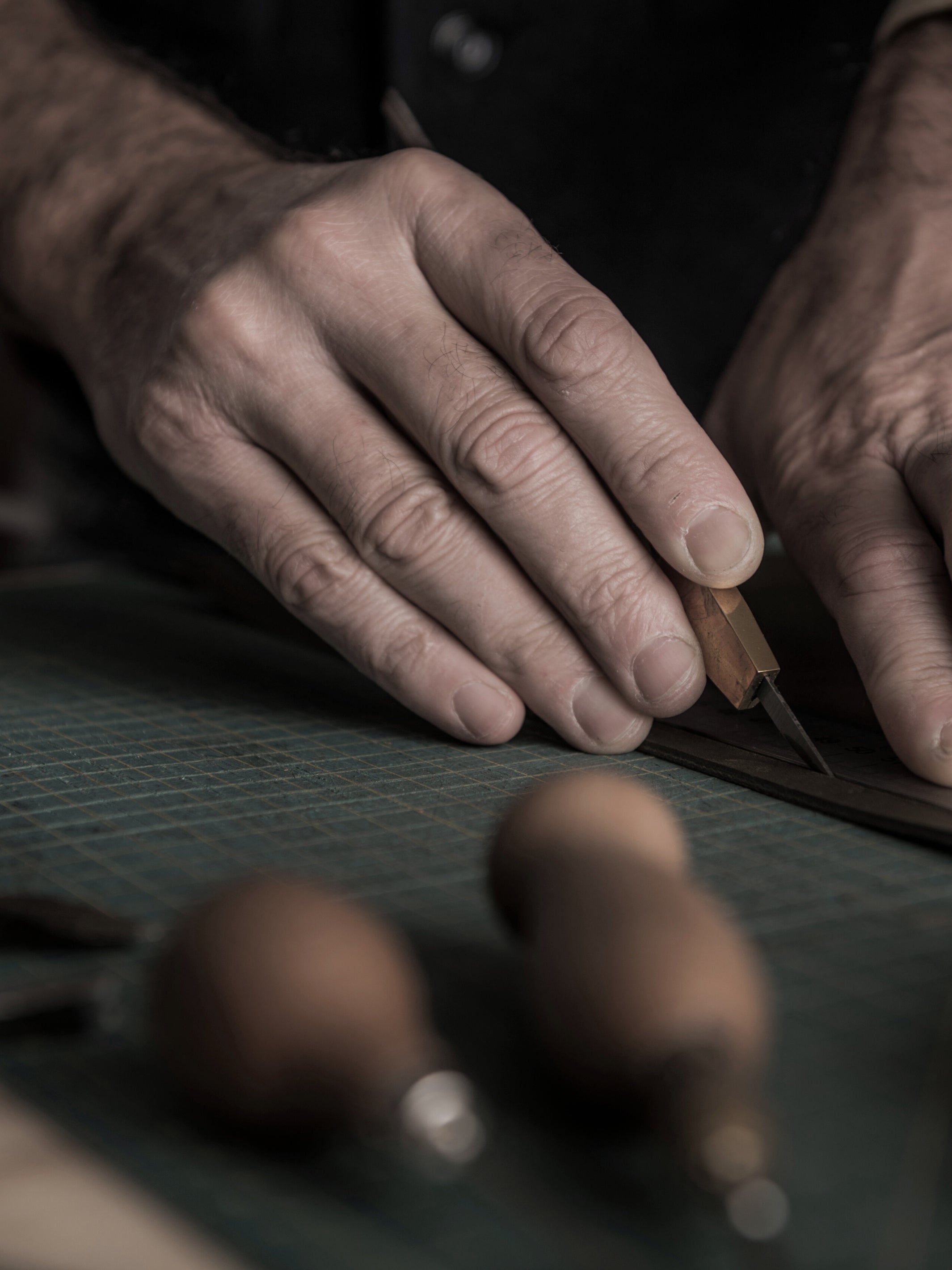 Avant toute coupe, chaque peau est contrôlée à la main et à l’œil, pour garantir sa qualité, sa régularité, et sa capacité à traverser le temps.